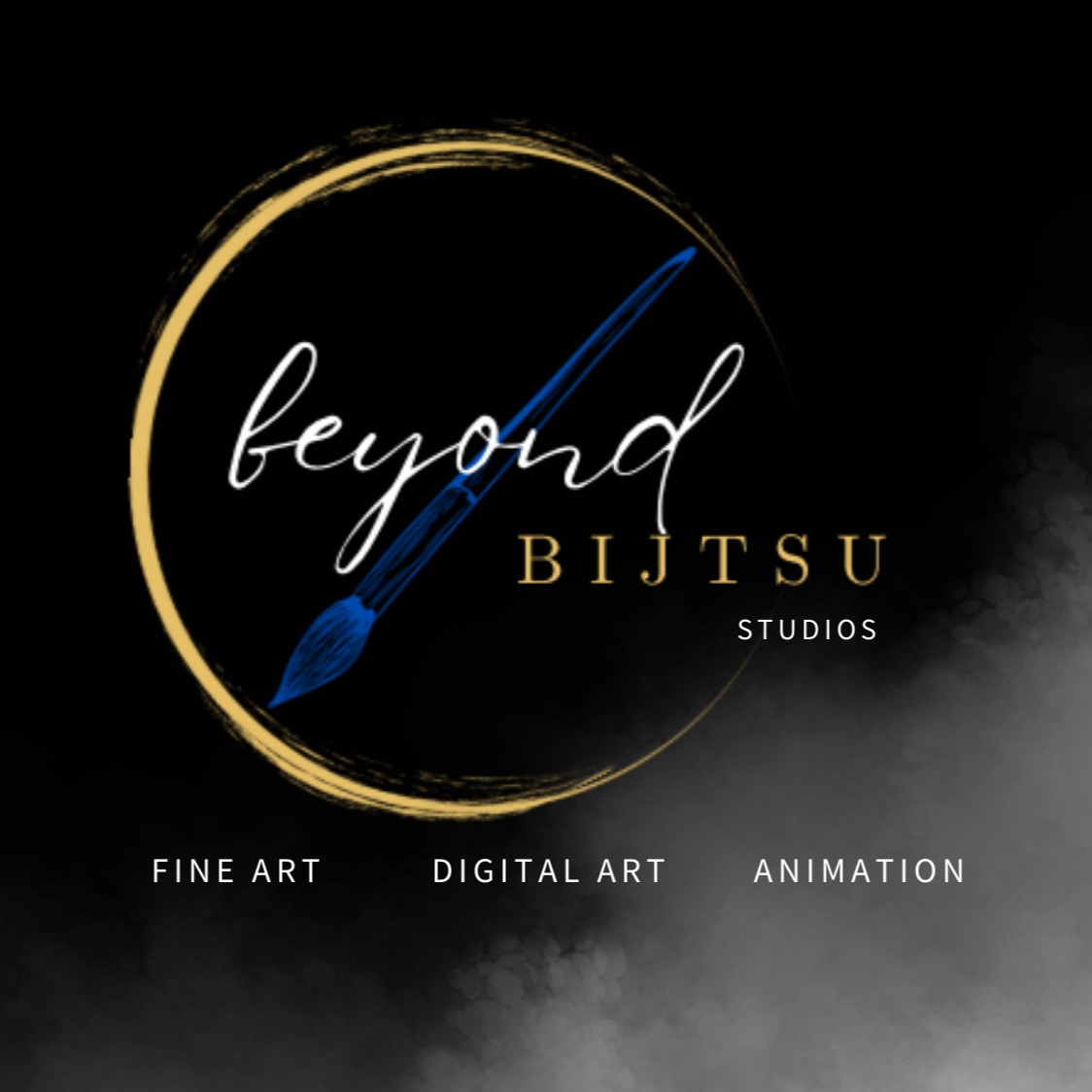 Logo for Beyond Bijitsu Studios featuring a circular brush stroke, a blue paintbrush, and text indicating fine art, digital art, and animation.