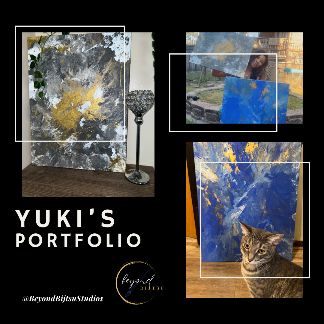 Collage of four photos showcasing Yuki's abstract art portfolio, featuring various blue, gray, white, and gold paintings, with a girl holding a painting outdoors, and a tabby cat sitting next to a blue and gold artwork.